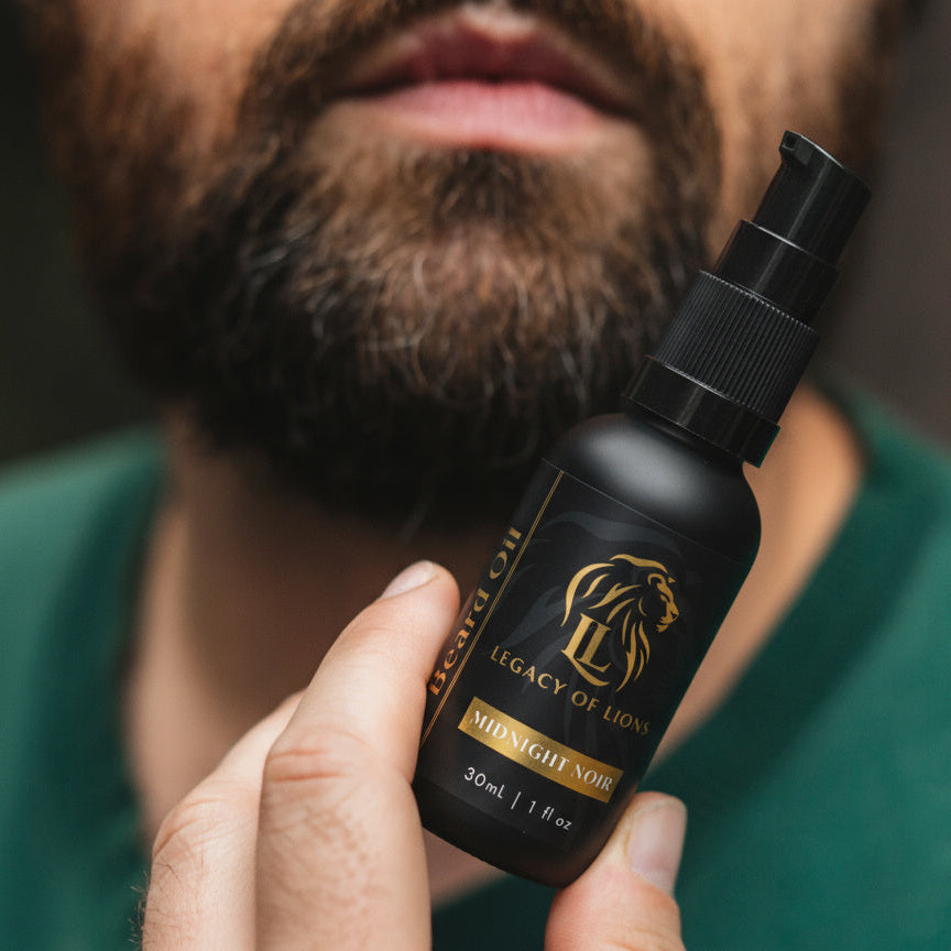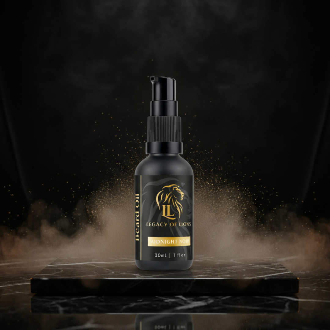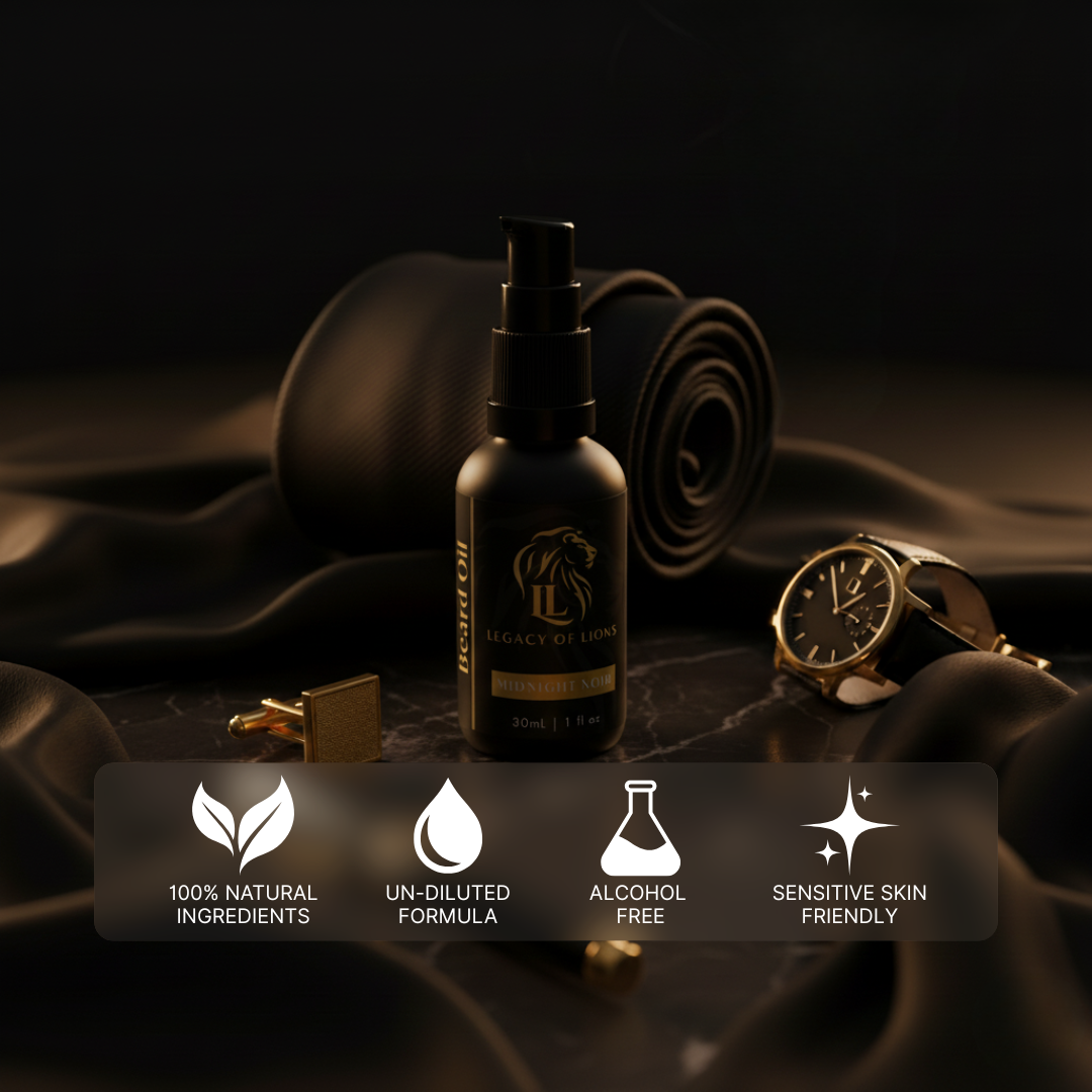 Midnight Noir is the bold, mysterious expression of Legacy of Lions — a luxury beard oil crafted for the modern gentleman whose presence is magnetic after dark.